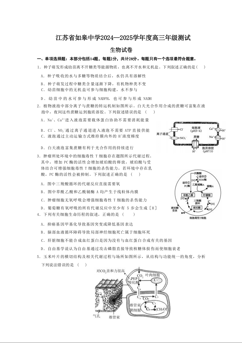江苏省如皋中学2024-2025学年度高三年级期初测试 生物