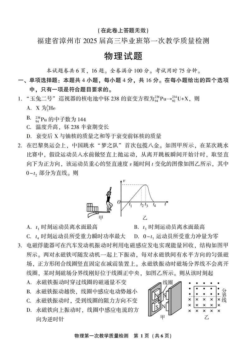 福建省漳州市2025届高中毕业班第一次质量检测 物理