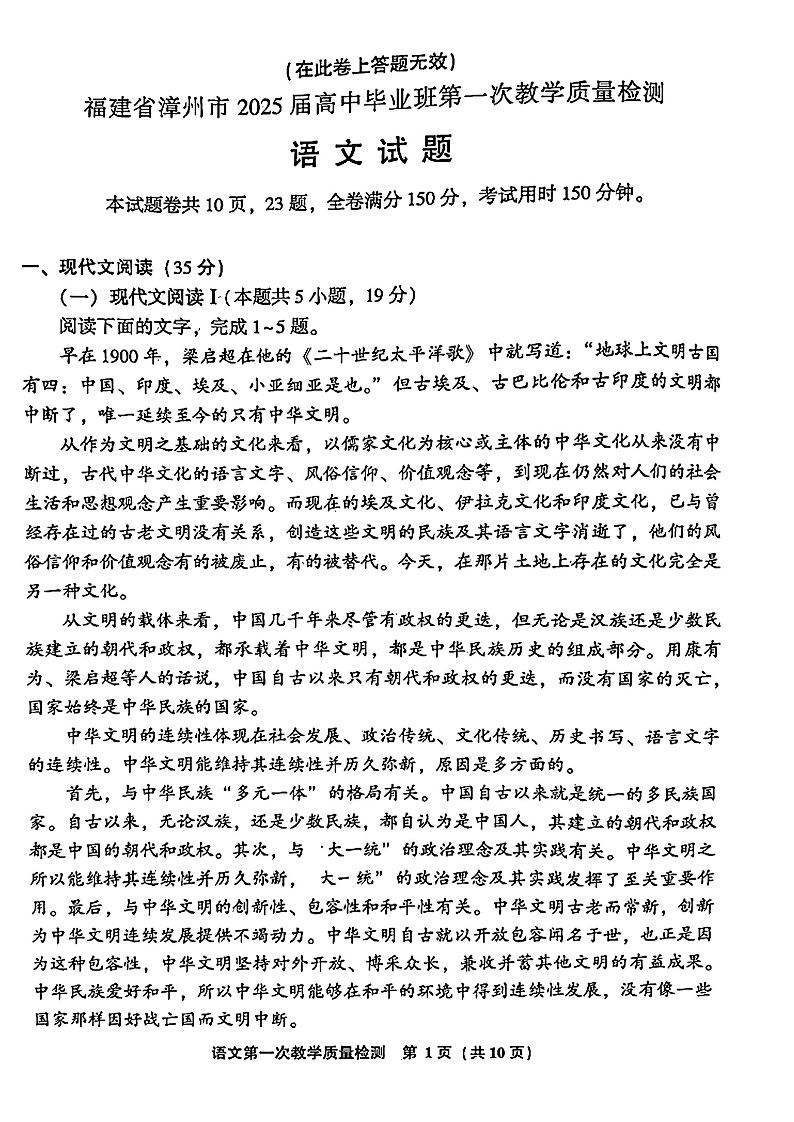 福建省漳州市2025届高中毕业班第一次质量检测 语文