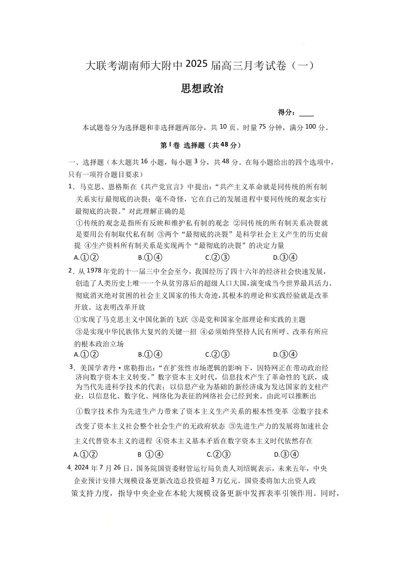 湖南师大附中2025届高三月考试卷(一)政治