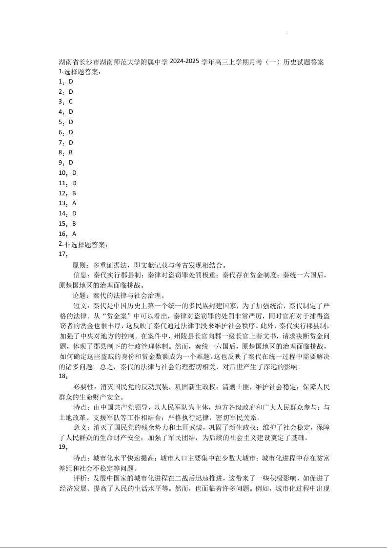 湖南师大附中2025届高三月考试卷(一)历史答案