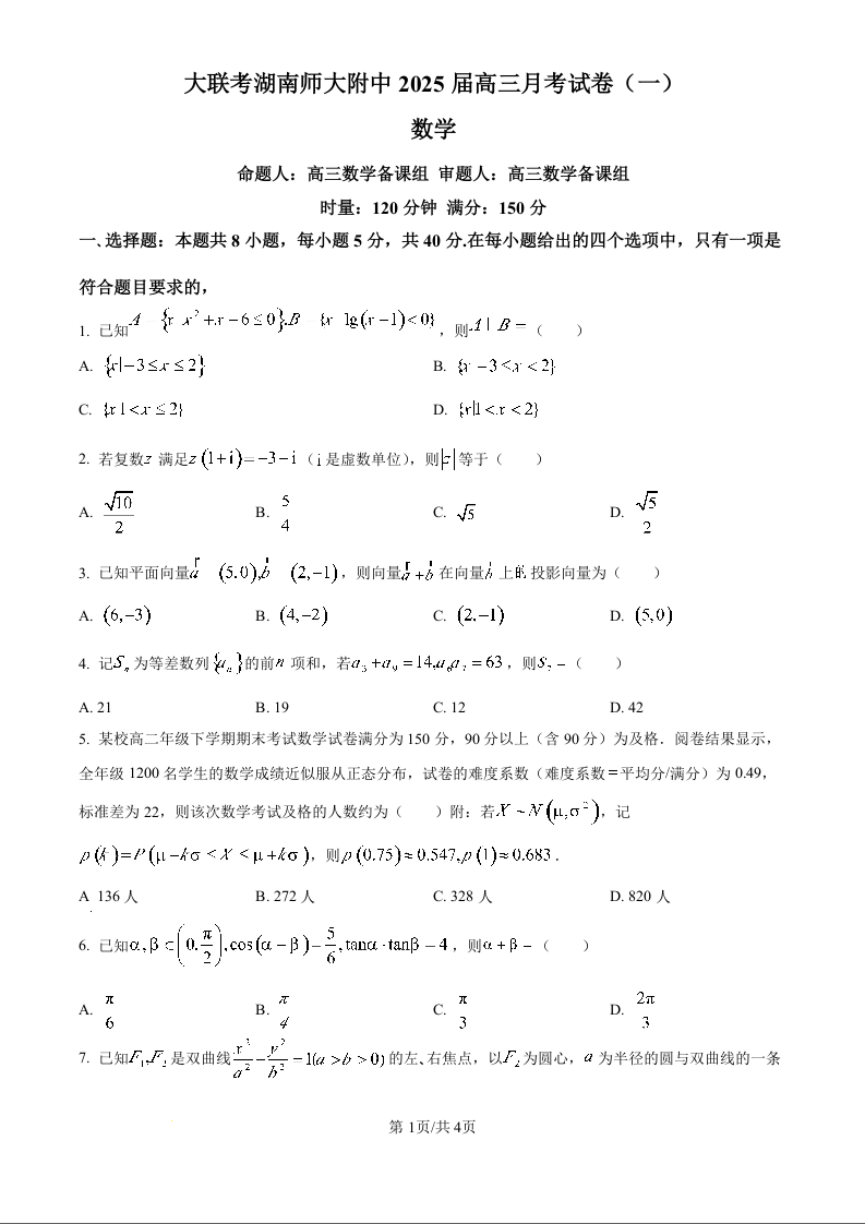 湖南师大附中2025届高三月考试卷(一)数学