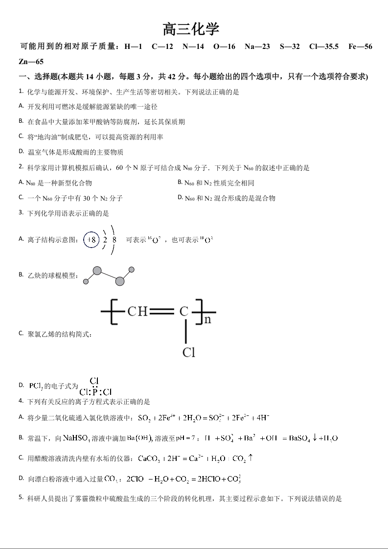 吉林省通化市梅河口市第五中学2025届高三9月月考 化学