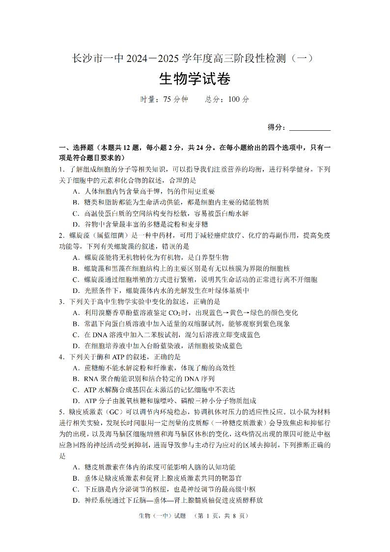 湖南省长沙市一中2024-2025学年高三阶段性检测(一)生物