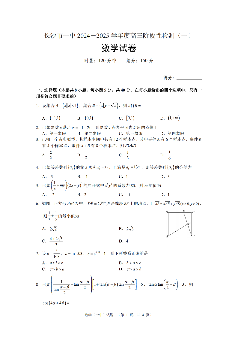 湖南省长沙市一中2024-2025学年高三阶段性检测(一)数学