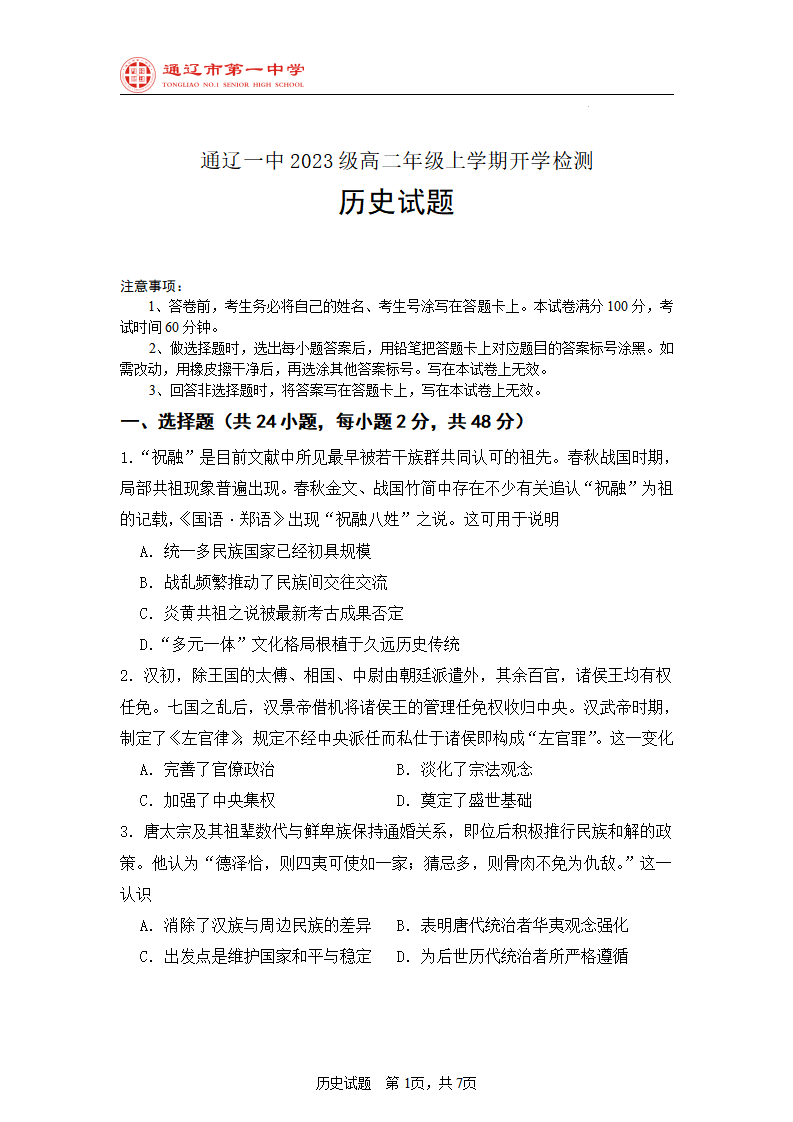 内蒙古通辽市第一中学2023级高二年级上学期开学检测 历史