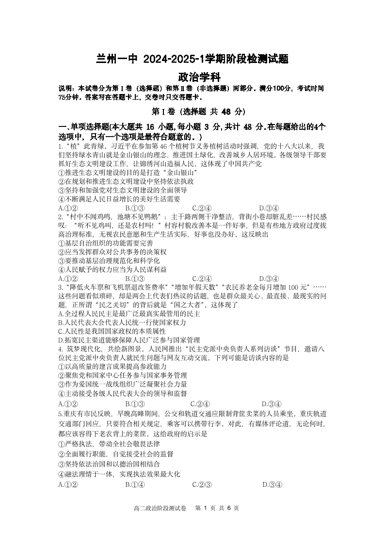 甘肃省兰州一中2024-2025学年高二上学期阶段检测 政治