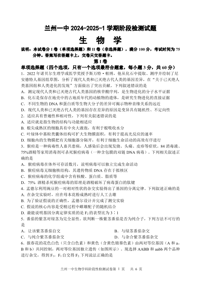 甘肃省兰州一中2024-2025学年高二上学期阶段检测 生物
