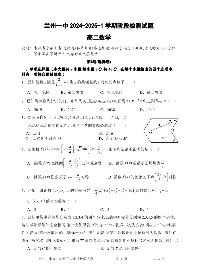 甘肃省兰州一中2024-2025学年高二上学期阶段检测 数学