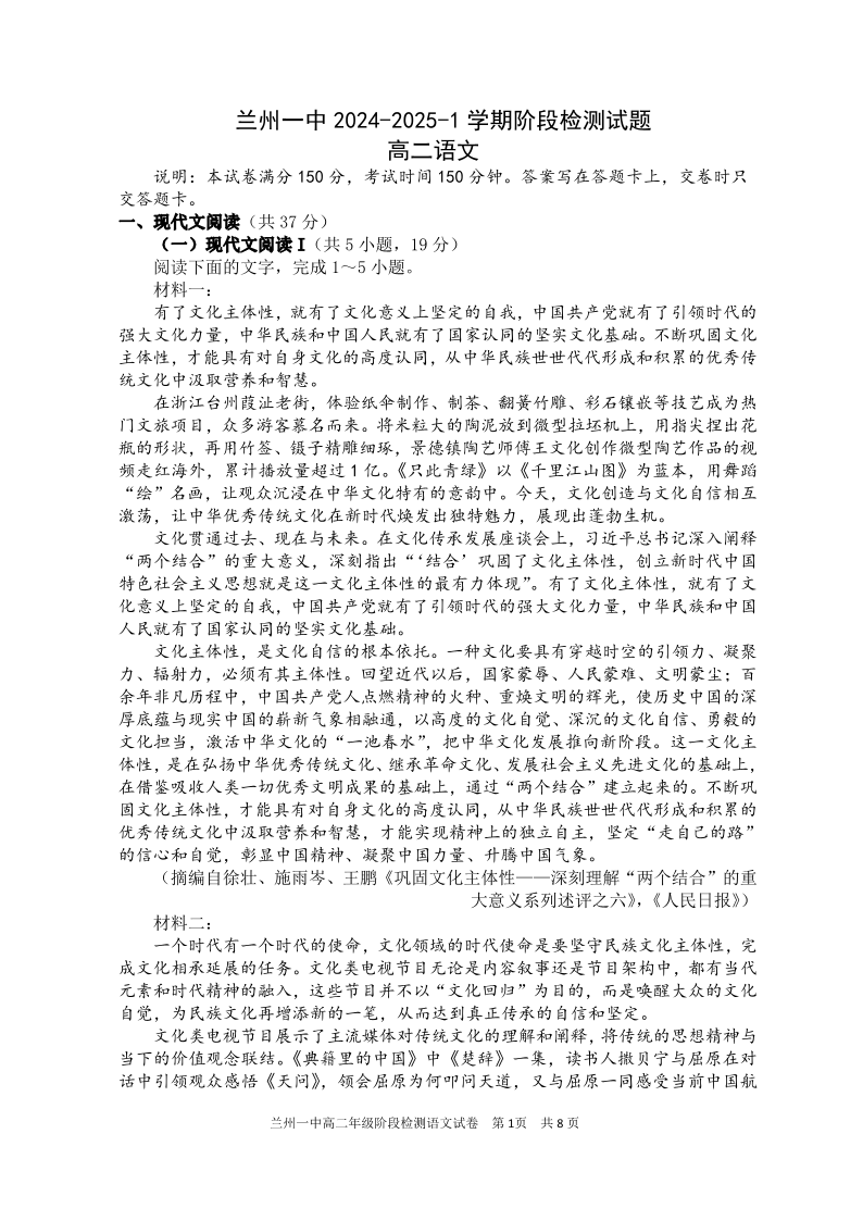 甘肃省兰州一中2024-2025学年高二上学期阶段检测 语文