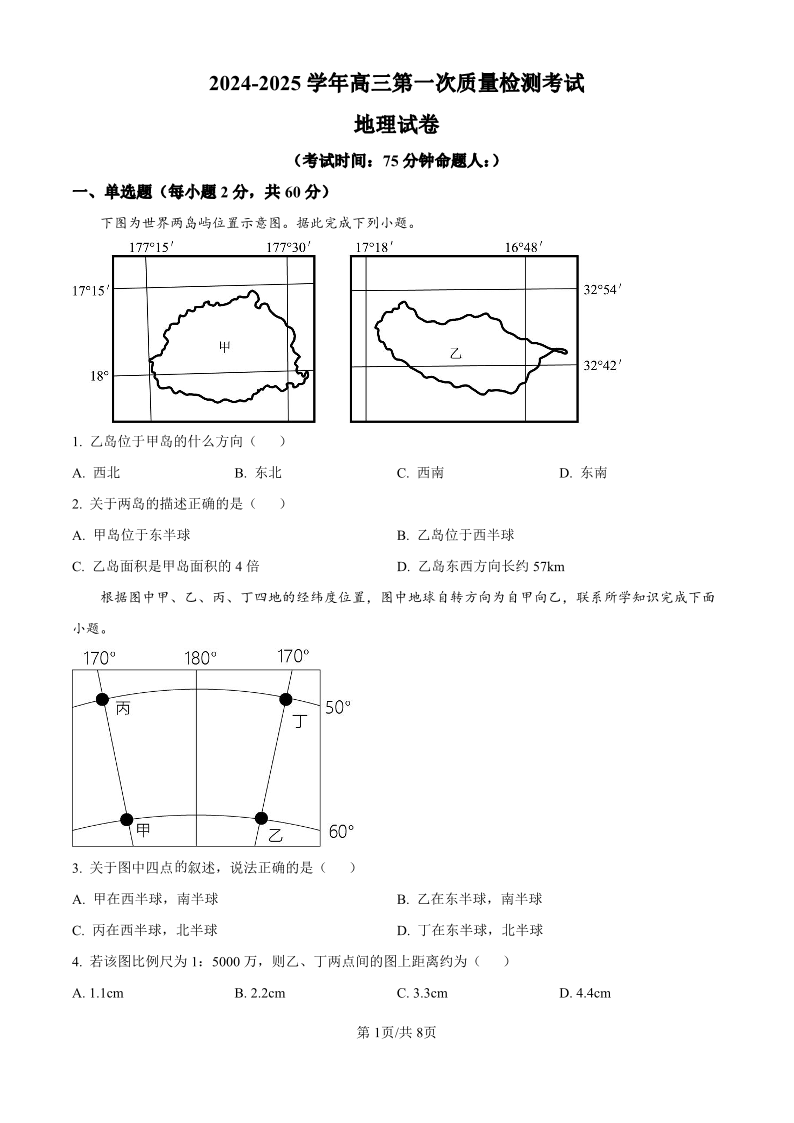 甘肃省武威市凉州区2024-2025学年高三第一次质量检测 地理