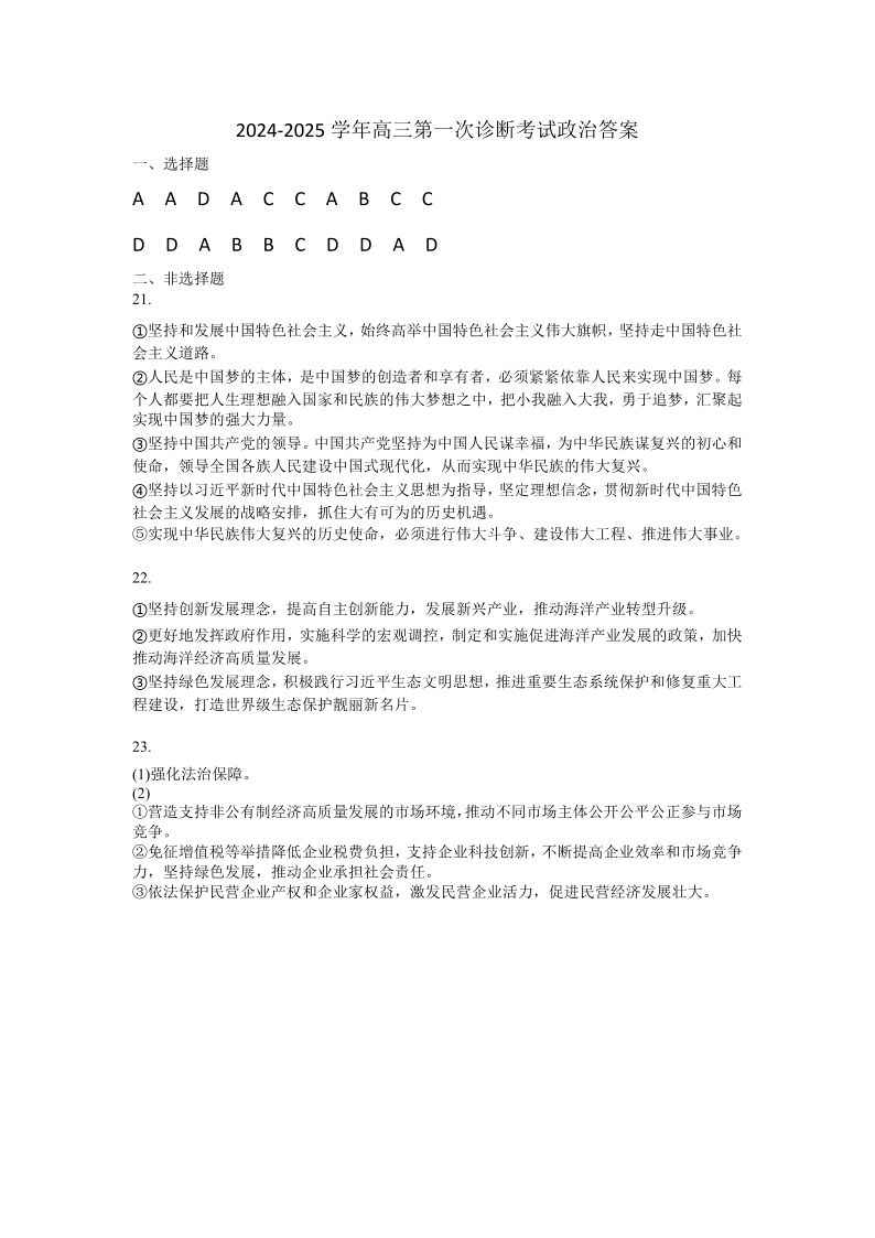 甘肃省武威市凉州区2024-2025学年高三第一次质量检测 政治答案