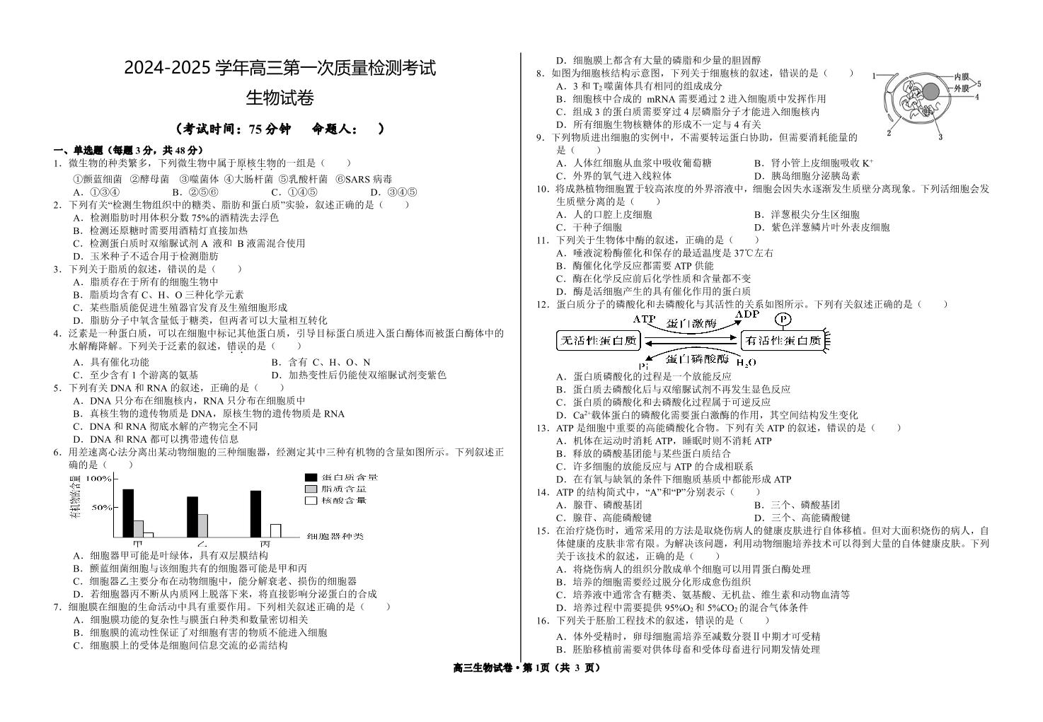 甘肃省武威市凉州区2024-2025学年高三第一次质量检测 生物