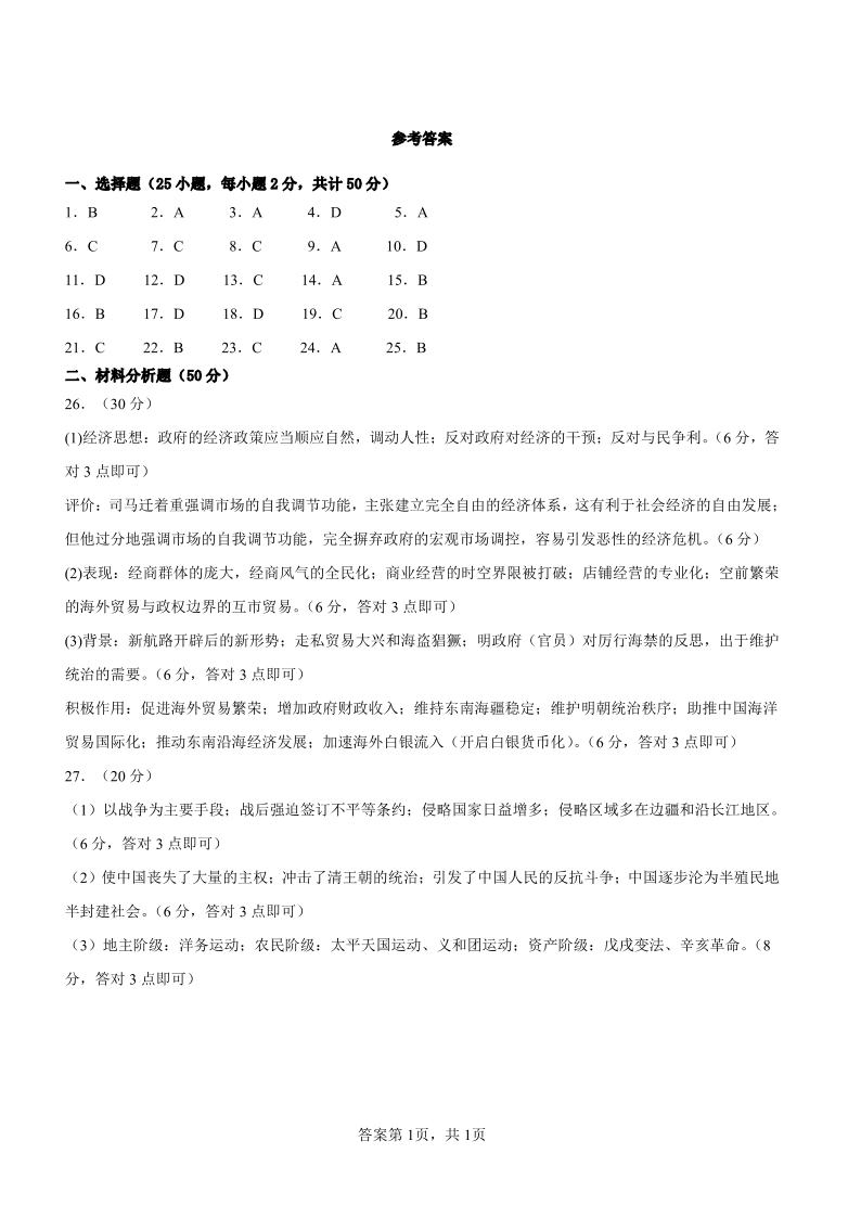 甘肃省武威市凉州区2024-2025学年高三第一次质量检测 历史答案
