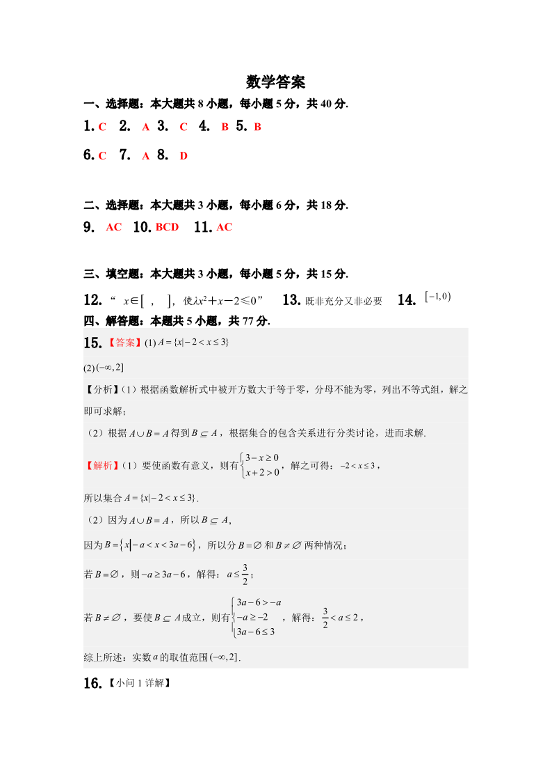 甘肃省武威市凉州区2024-2025学年高三第一次质量检测 数学答案