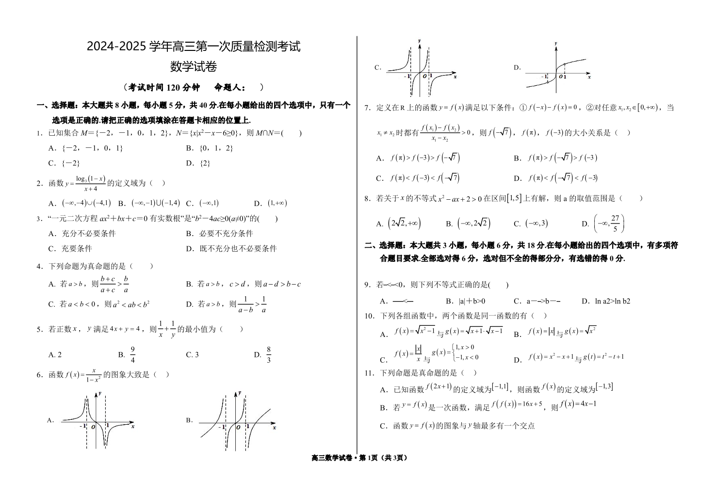 甘肃省武威市凉州区2024-2025学年高三第一次质量检测 数学