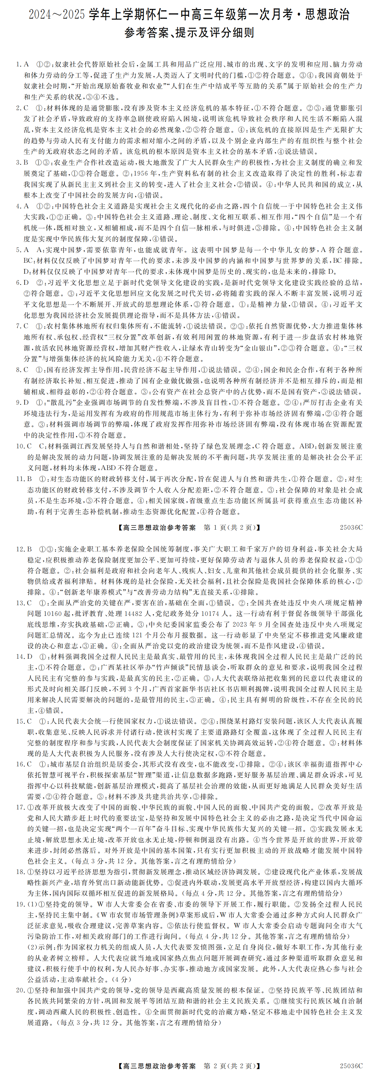 山西省2024-2025学年上学期怀仁一中高三年级第一次月考 政治答案