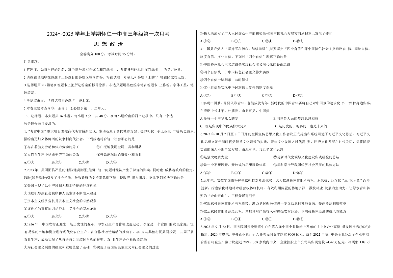 山西省2024-2025学年上学期怀仁一中高三年级第一次月考 政治