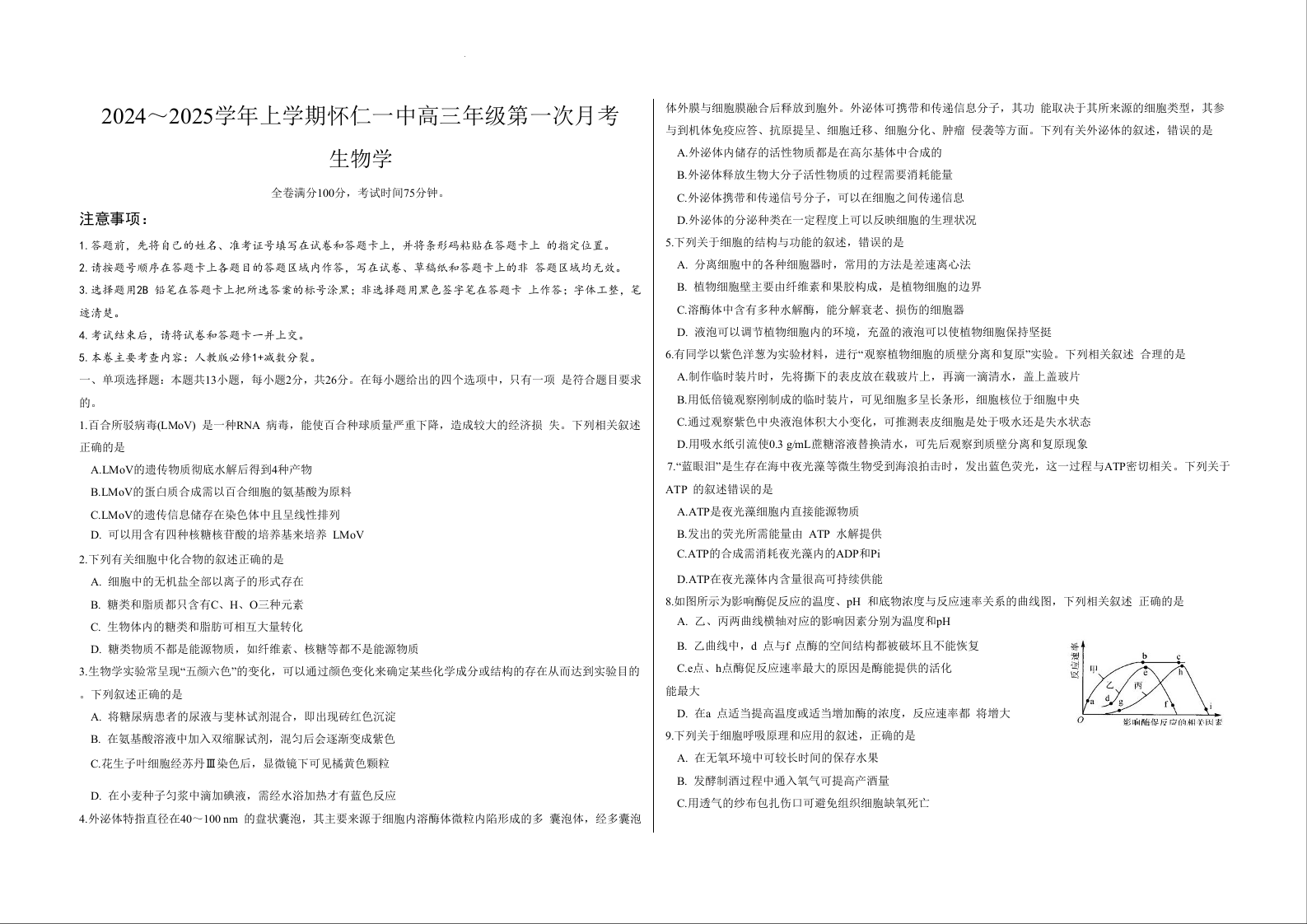 山西省2024-2025学年上学期怀仁一中高三年级第一次月考 生物
