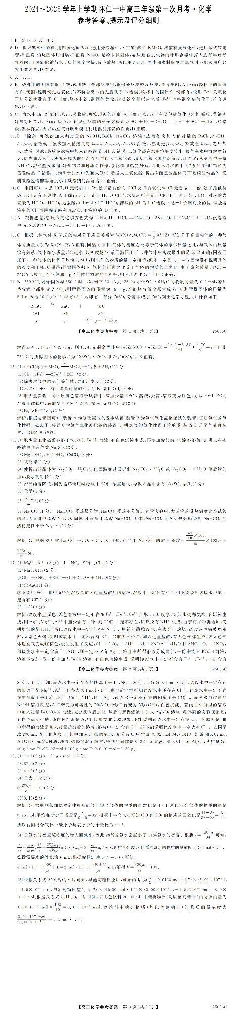 山西省2024-2025学年上学期怀仁一中高三年级第一次月考 化学答案