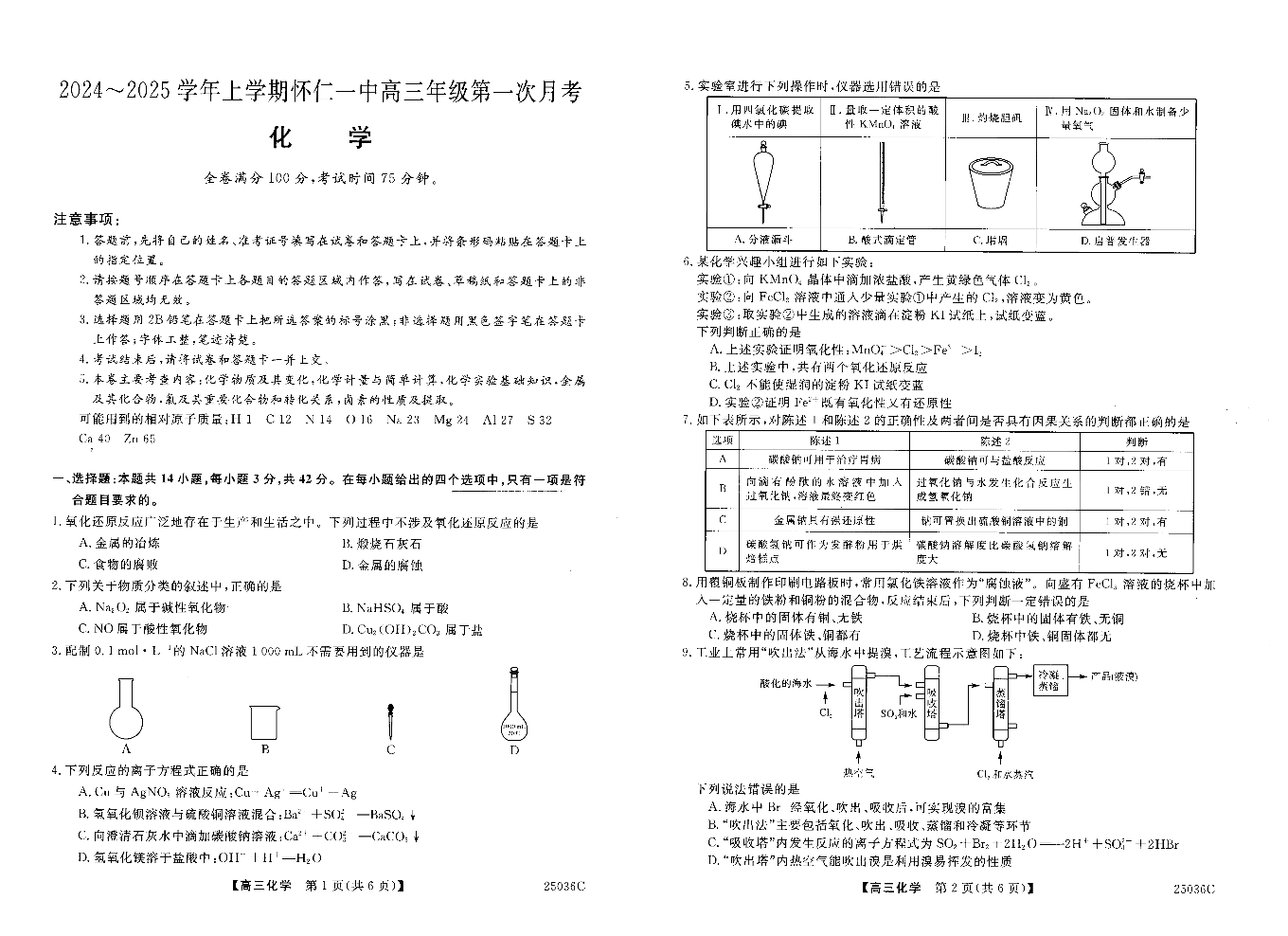 山西省2024-2025学年上学期怀仁一中高三年级第一次月考 化学