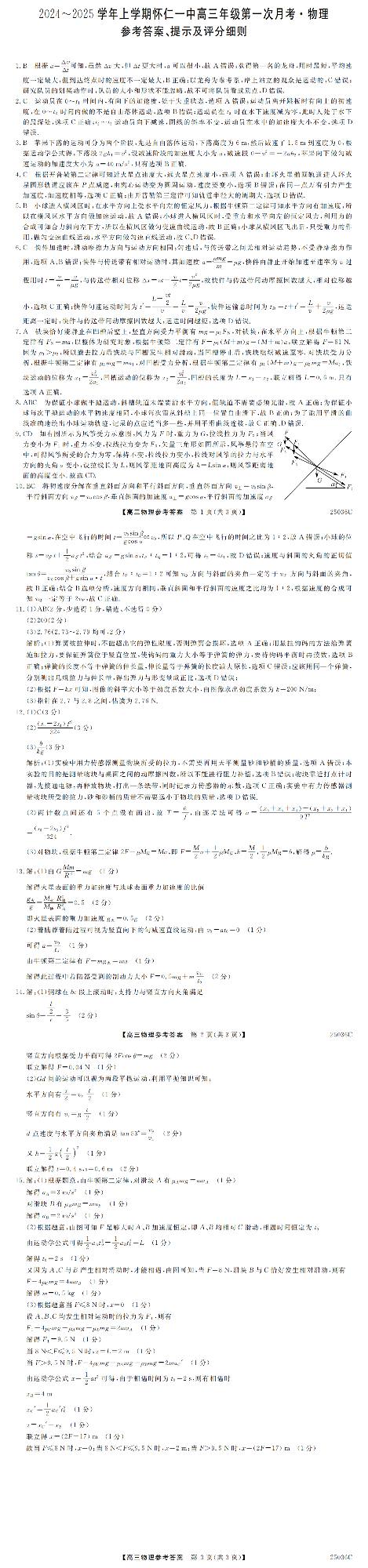 山西省2024-2025学年上学期怀仁一中高三年级第一次月考 物理答案