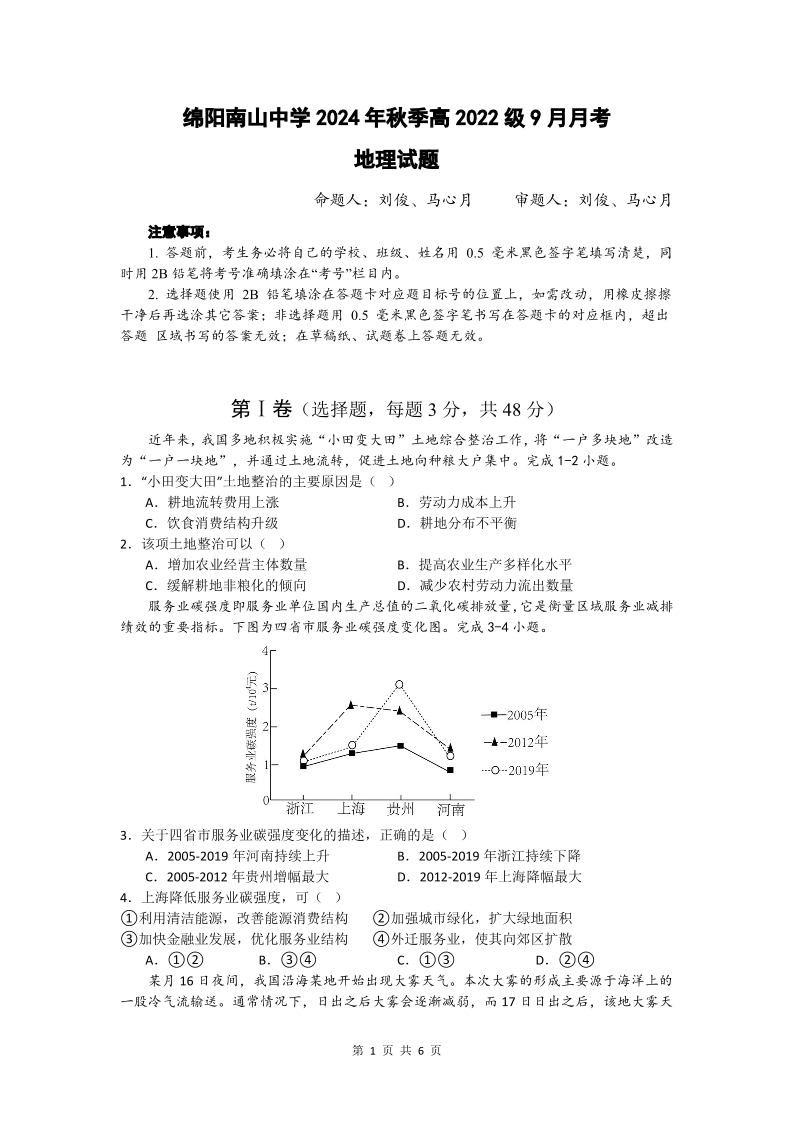 四川省绵阳南山中学高2022级9月月考 地理