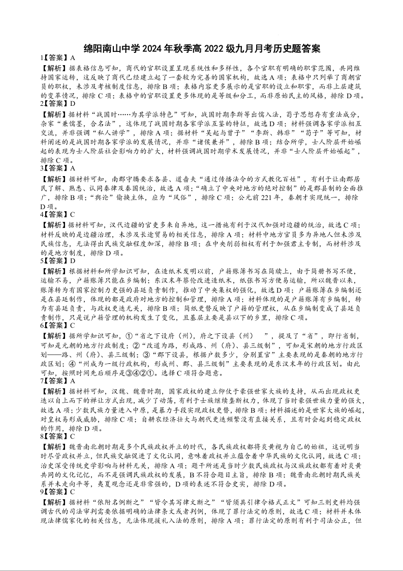 四川省绵阳南山中学高2022级9月月考 历史答案