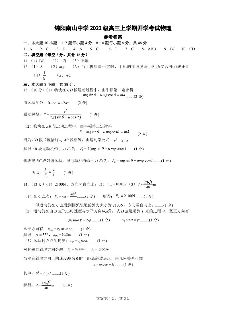 四川省绵阳南山中学高2022级9月月考 物理答案