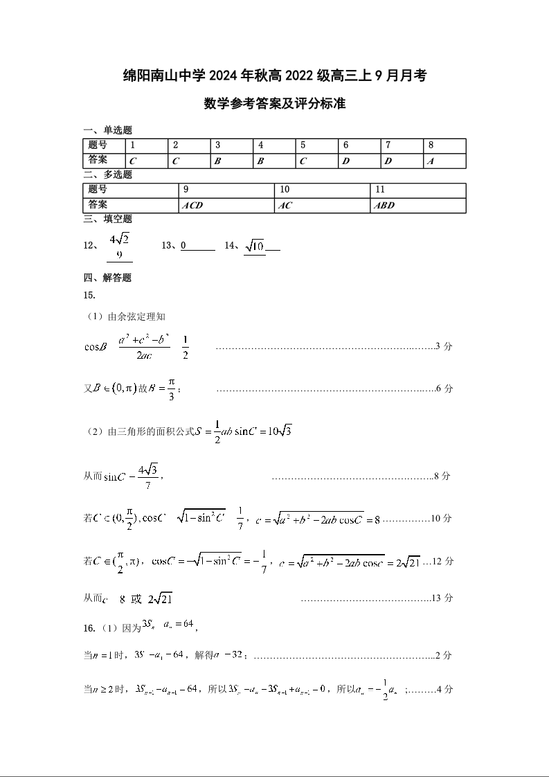 四川省绵阳南山中学高2022级9月月考 数学答案