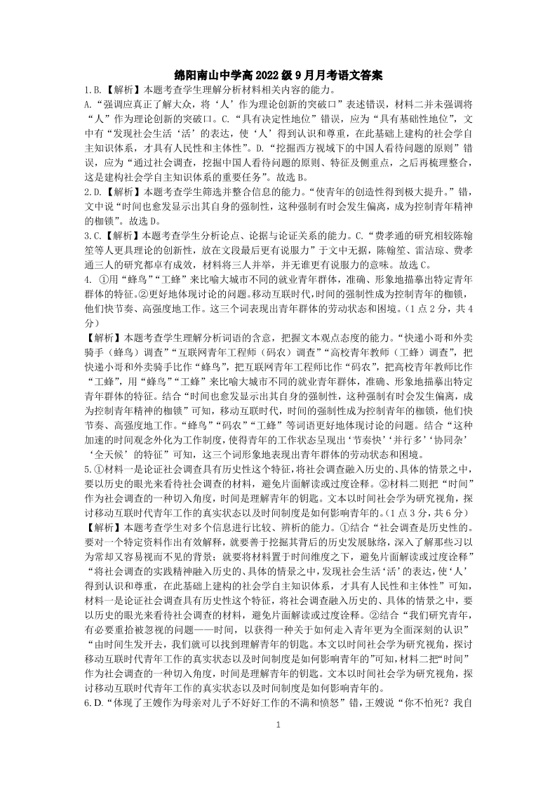 四川省绵阳南山中学高2022级9月月考 语文答案