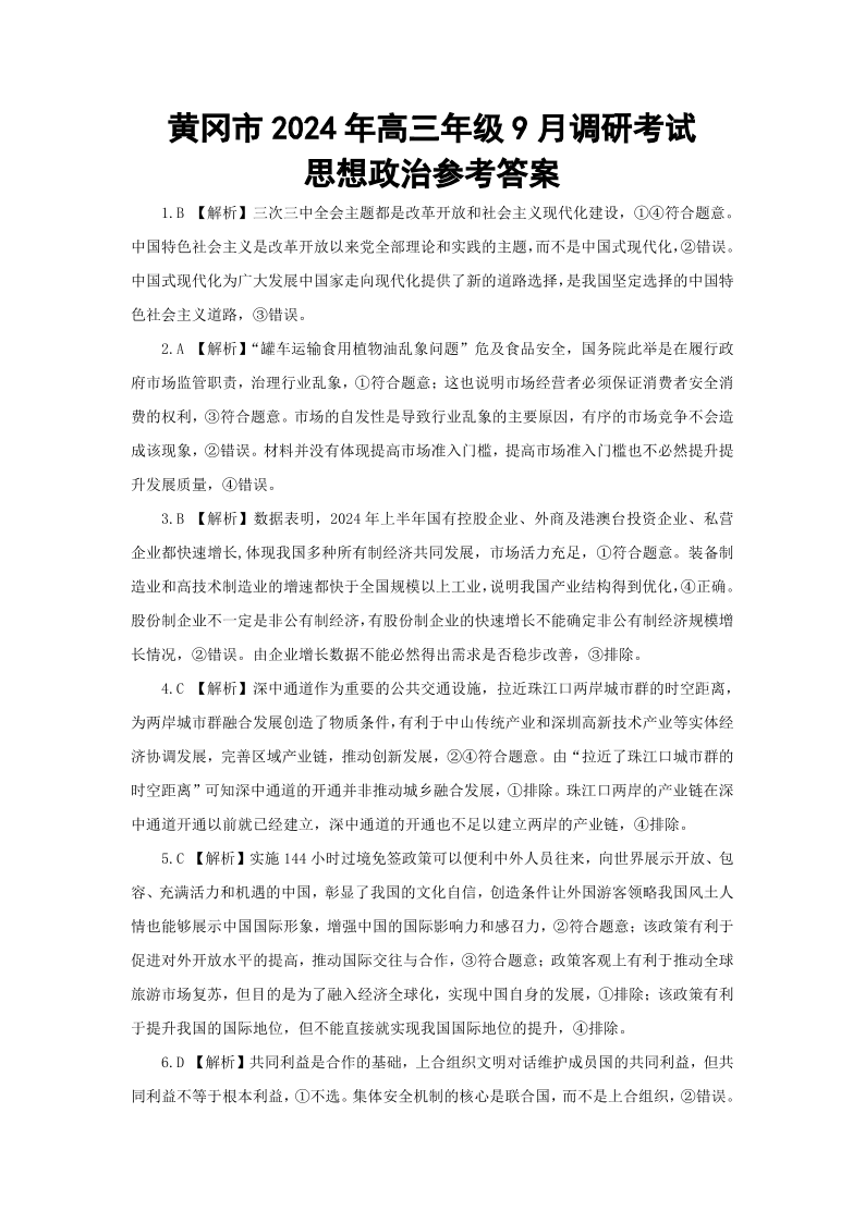 湖北省黄冈市2024年高三年级9月调研考试 政治答案