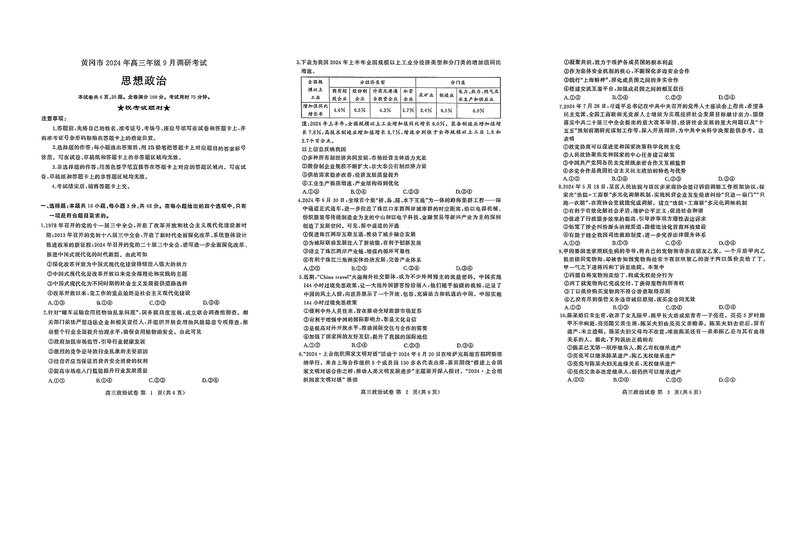 湖北省黄冈市2024年高三年级9月调研考试 政治