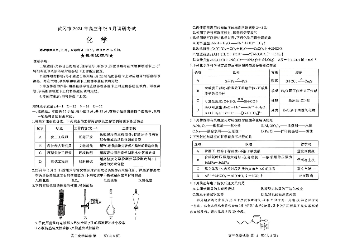 湖北省黄冈市2024年高三年级9月调研考试 化学