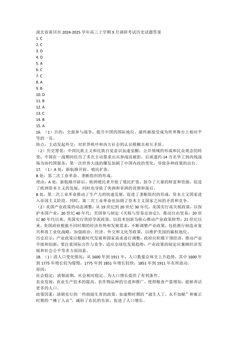 湖北省黄冈市2024年高三年级9月调研考试 历史答案