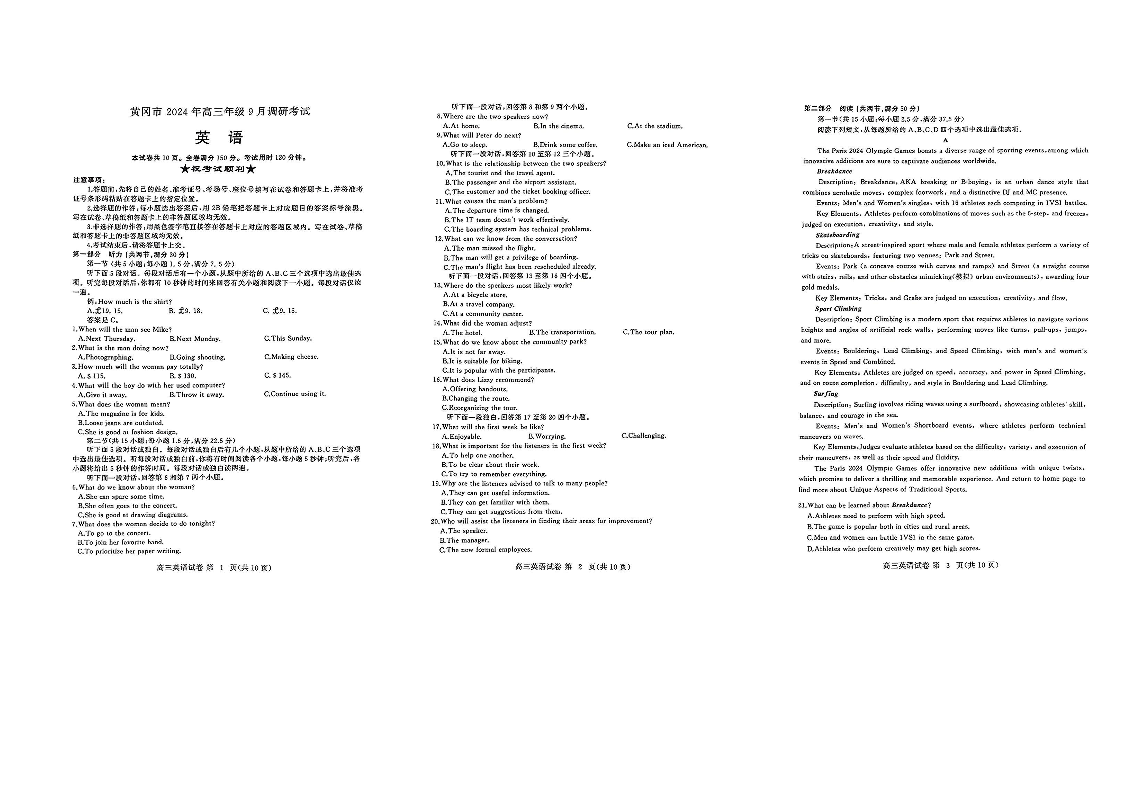 湖北省黄冈市2024年高三年级9月调研考试 英语
