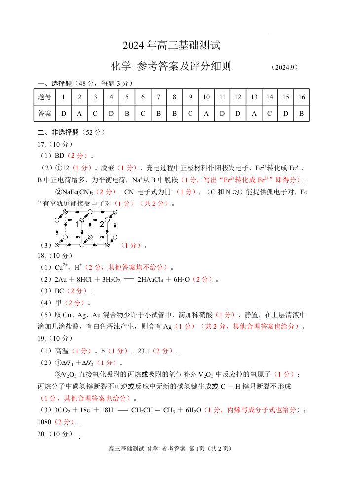 浙江省嘉兴市2024-2025学年高三基础测试 化学答案