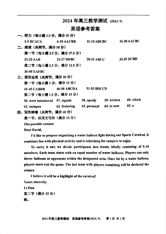 浙江省嘉兴市2024-2025学年高三基础测试 英语答案
