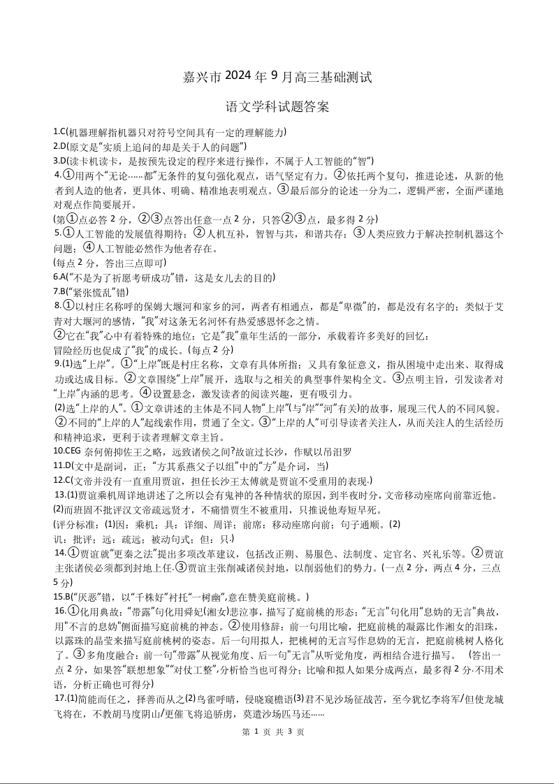 浙江省嘉兴市2024-2025学年高三基础测试 语文答案