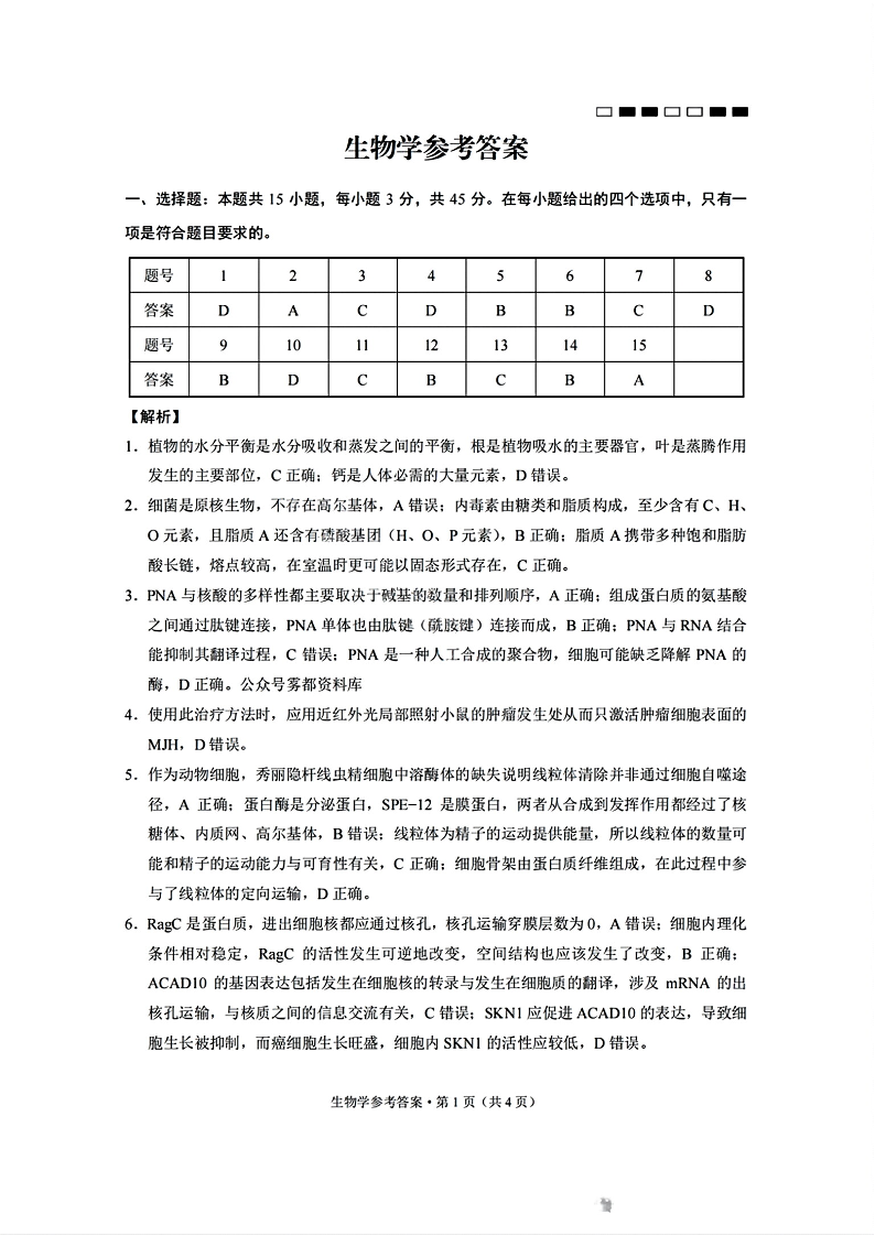 巴蜀中学2025届高考适应性月考卷(一)生物答案
