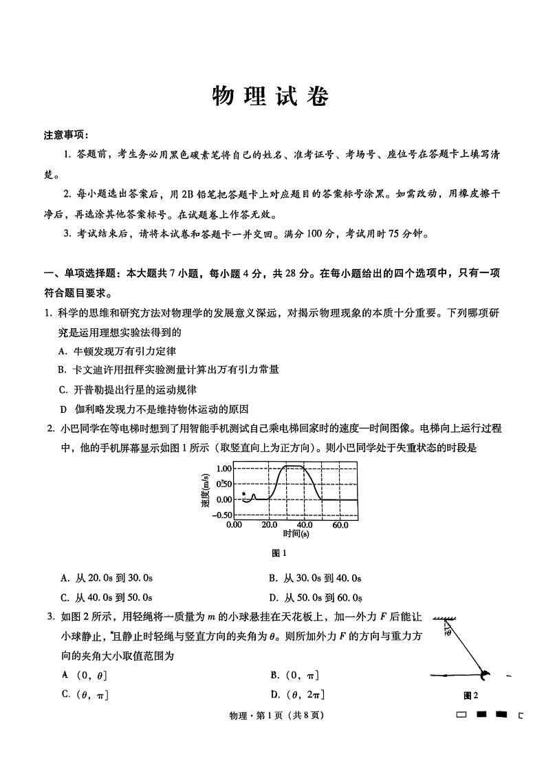 巴蜀中学2025届高考适应性月考卷(一)物理