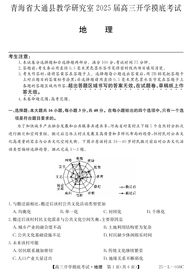 青海省西宁市大通回族土族自治县2025届高三开学摸底考试 地理
