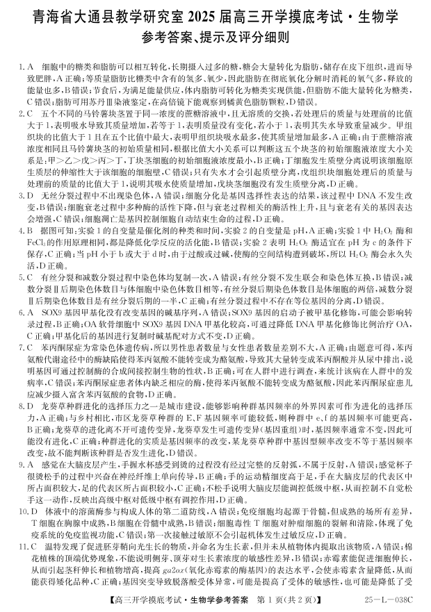 青海省西宁市大通回族土族自治县2025届高三开学摸底考试 生物答案