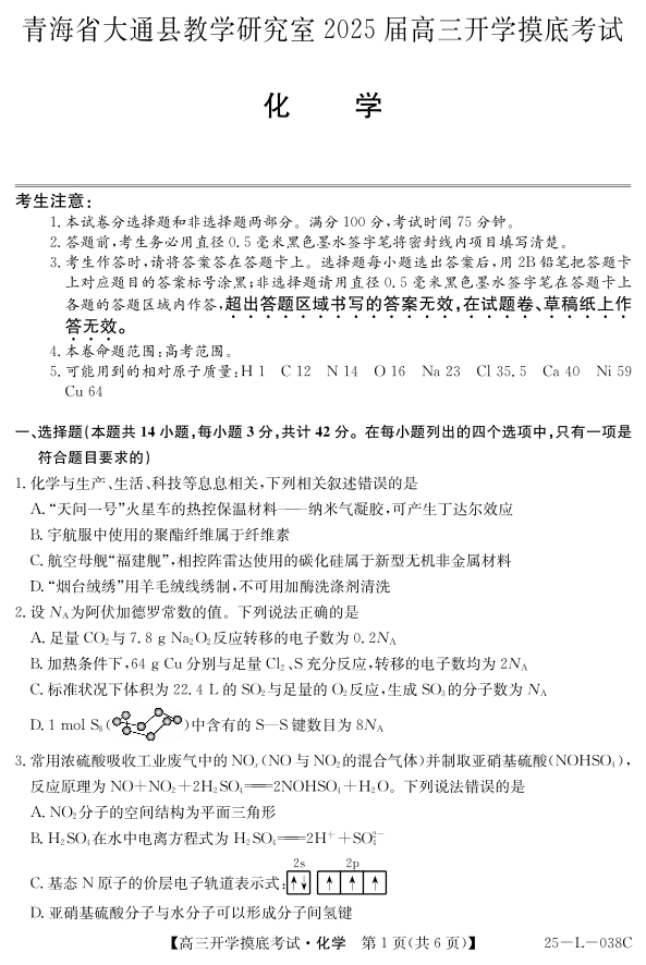 青海省西宁市大通回族土族自治县2025届高三开学摸底考试 化学