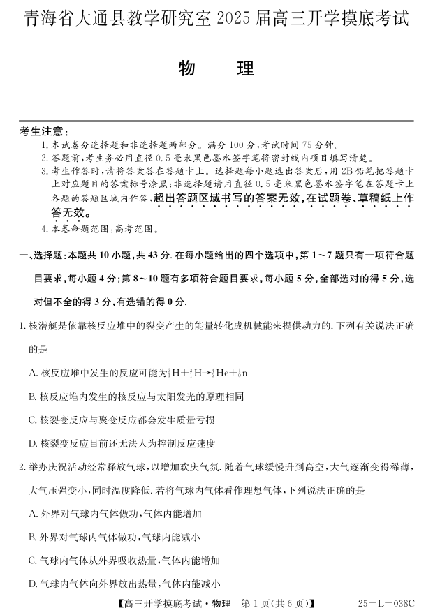 青海省西宁市大通回族土族自治县2025届高三开学摸底考试 物理