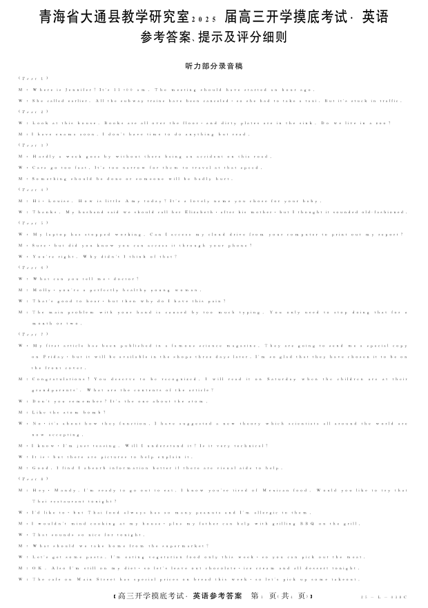 青海省西宁市大通回族土族自治县2025届高三开学摸底考试 英语答案