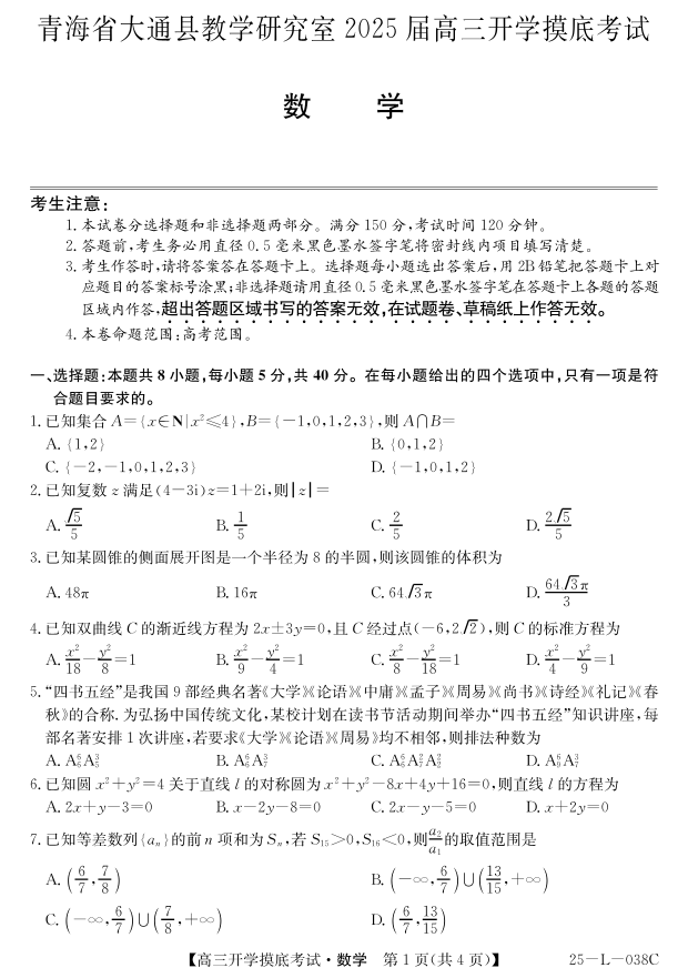 青海省西宁市大通回族土族自治县2025届高三开学摸底考试 数学