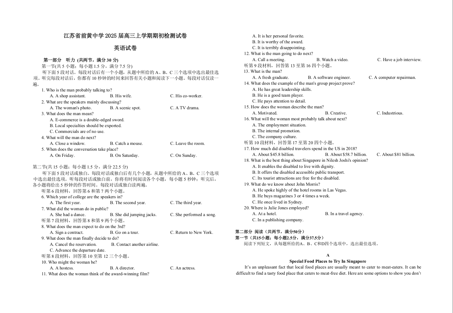 江苏省前黄高级中学2024-2025学年高三上学期期初检测 英语