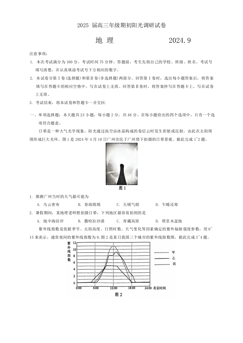 江苏省苏州市2025届高三年级期初阳光调研试卷 地理
