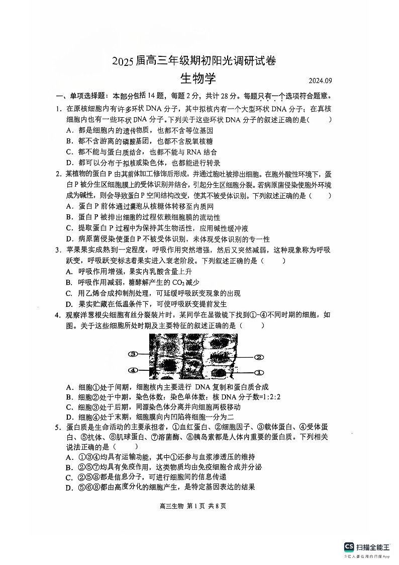 江苏省苏州市2025届高三年级期初阳光调研试卷 生物
